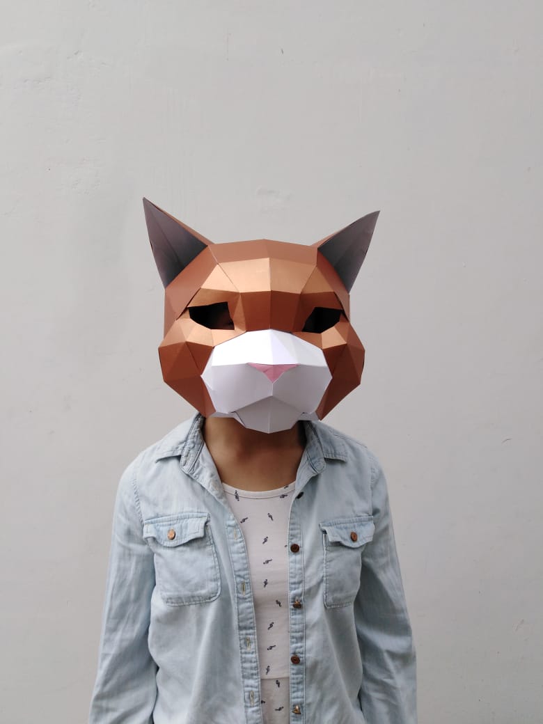 I purchased the cat head pattern. This is the first paper mask Ive made and I found this pattern super straightforward. Assembly is matching flaps to edges with numbers. It took me 7 hours (cutting, folding, gluing).